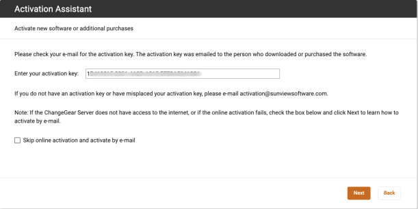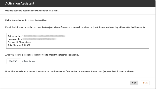 For ChangeGear offline activation, check the Skip online activation and activate by e-mail checkbox and click Next. Copy and email the information shown in the screen to the email address activation@sunviewsoftware.com as seen below.