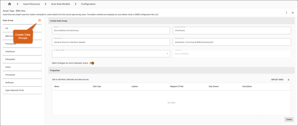 The interface displays the Data Group Editor. Here, you can create data groups and add properties to the data model, such as custom fields or data sources specific to your environment (e.g., SNMP fields for a new printer model).