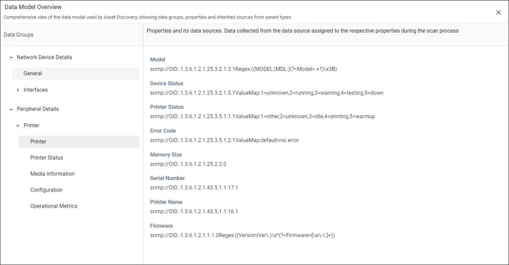 This example shows how an HP Printer is classified under Peripheral > Printer > Network. Data Groups like "Printer Status" and "Media Information" contain properties (e.g., Model, Device Status) mapped to SNMP OIDs for accurate discovery and classification.