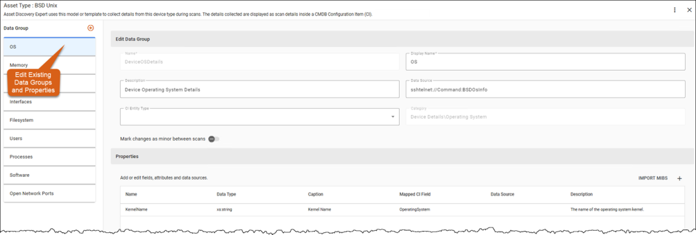 Data Source - The method or protocol (e.g., SNMP OID) used to retrieve the data for this property during scans. This enables the system to know how and where to collect information for a field. See Supported Data Sources.