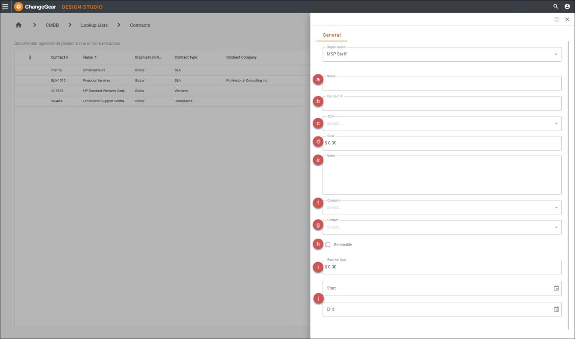 A contract in ChangeGear is a specific contract for some type of service with a third party, such as a support agreement with Serviceaide. Contracts are a flexible means to track both your organization's various contracts and to which CI they are associated. It also effectively disseminates information to others in your organization by having information about the contract, including the contract issuer, contact information, and notes associated directly with each CI. Contracts usually have a contract number, company, contact, monetary value, and duration.