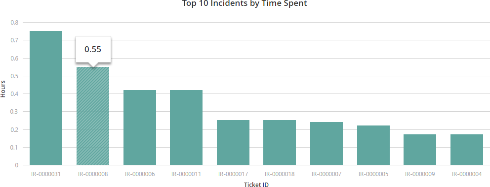Top 10 Incidents by Time Spent is a bar chart displaying the total number of hours spent on ten tickets organized from the most amount of time to the least amount of time.