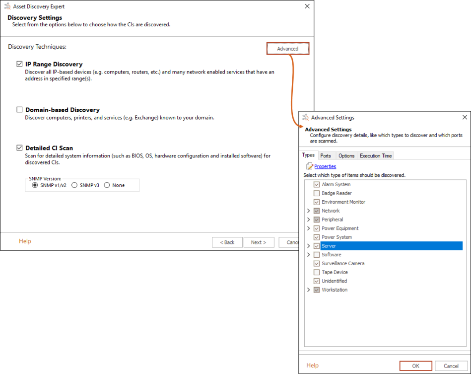 The Type tab manages which resource types are discovered, while the Port tab manages which ports are scanned and what resource types are mapped to each port. The Options tab manages what discovery and scanning methods are used when ADE is run, and the Execution Time tab sets the maximum amount of time the ADE will spend scanning a single device.