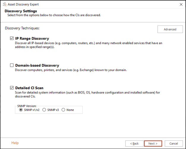 By selecting the Detailed Resource Scan, the ADE will gather machine information (such as BIOS, OS, hardware configuration) for resources discovered during scanning. Scanning can take place independently of the other selections or in conjunction with the selections. This information is viewable on the Configuration tab of the CI in the CMDB. If you wish to detect SNMP devices, select the version that you wish to use in your scan. Alternatively, select None to avoid using SNMP.